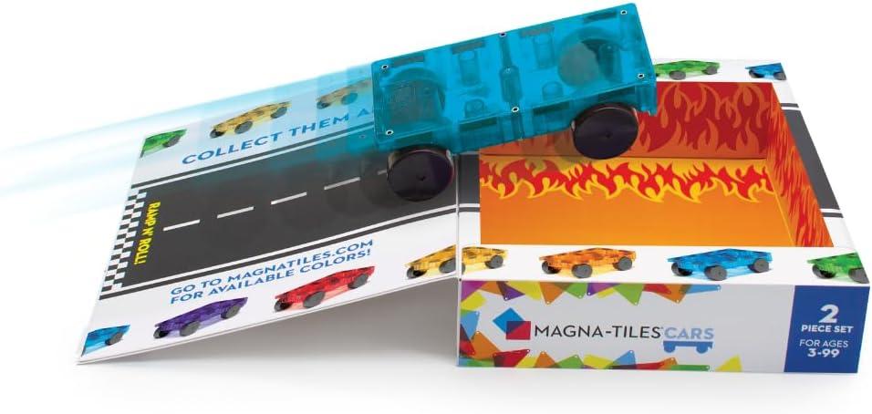MAGNA-TILES Cars – Green & Yellow 2-Piece Magnetic Construction Set, The ORIGINAL Magnetic Building Brand(Blue & Orange)