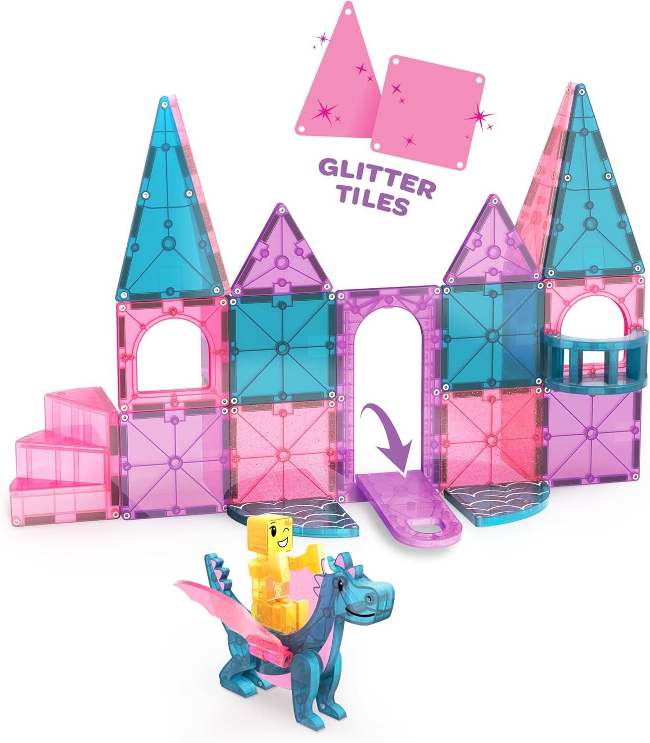 What’s Included: 25 magnetic pieces, including 1 Drawbridge, 1 Dragon Figure, 1 Royalty Figure, 1 Spiral Staircase, 1 Balcony, 2 Windows, 2 Equilateral Triangles, 2 Quarter Circles, 4 Isosceles Triangles (2 Glitter, 2 Standard) and 10 Squares (4 Glitter, 6 Standard). What Makes It Unique: Includes our first working Drawbridge, Spiral Staircase and Balcony, exclusive Dragon and Royalty figures, redesigned Windows for enhanced storytelling and imaginative play.