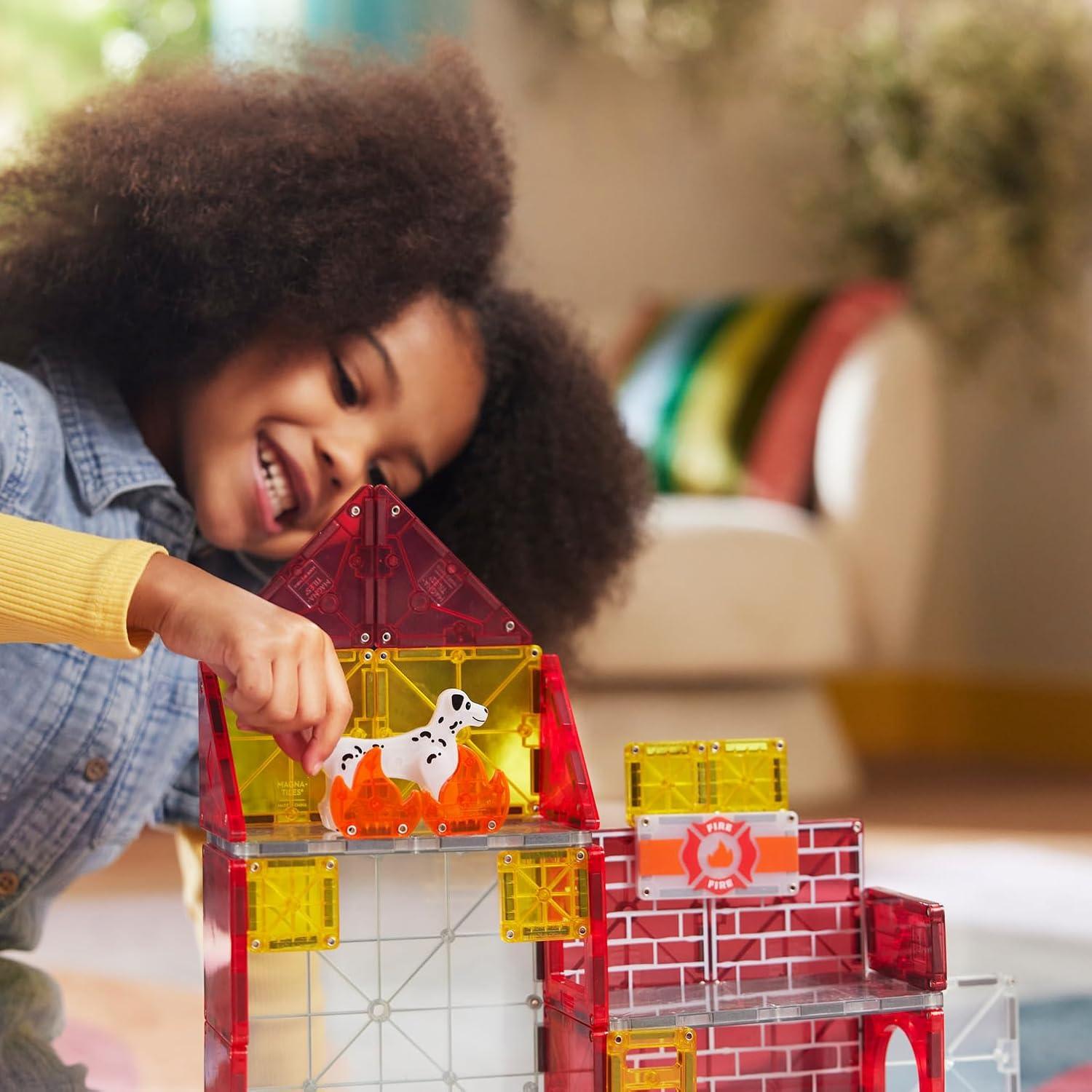 Step into action with the MAGNA-TILES® Fire Station Set! Create custom rescue vehicles with the all-new modular Fire Truck, complete with an extendable ladder to tackle towering blazes. Bring playtime to life with the Light & Sound Tile, featuring flashing lights and a siren for an authentic firefighting experience. Complete with a Firefighter Figure and their trusty magnetic Dalmatian companion. Use the easy-to-use microMAGS Cubes, attachable Fire Tiles, and functional Ladders and Fence to create dramatic, fun-filled rescue operations. The Fire Station Set sparks imaginative play, making every child the hero of their MAGNA-TILES® world! Pair it with the MAGNA-TILES® Police Station to complete your city and create a world of teamwork and adventure!”